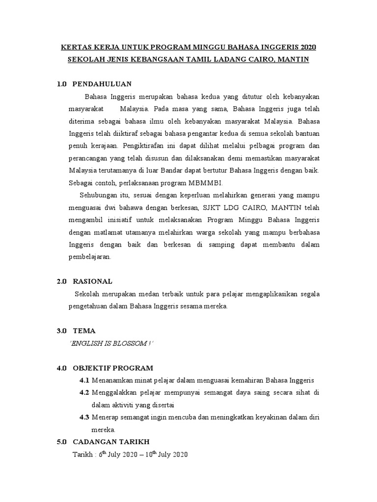 Kertas Kerja Untuk Program Minggu Bahasa Inggeris 2020 Pdf